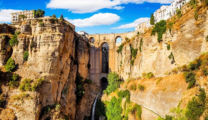 Pensar en Ronda es ver la imagen del Puente Nuevo cruzando el Tajo de Ronda. Se trata del lugar más emblemático de la ciudad, una construcción de finales del siglo XVIII que separa el casco histórico de las construcciones más recientes. La peculiaridad del lugar, lo que hace de él un lugar tan impactante, es la vista que proporciona el famoso Tajo, una garganta de piedra natural de más de 100 metros de profundidad por donde pasa el río Guadalevín.