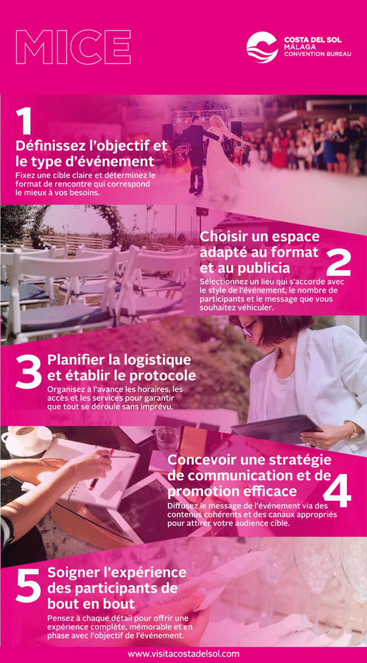 Chaque événement, aussi différent soit-il, partage une série de décisions clés qu'il est important de prendre avec ordre et perspective. Dans une destination comme la Costa del Sol, avec tant d'options et de possibilités, bien définir chaque phase vous aidera à tirer le meilleur parti des ressources disponibles.